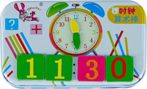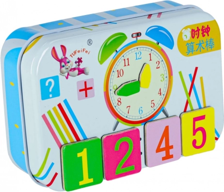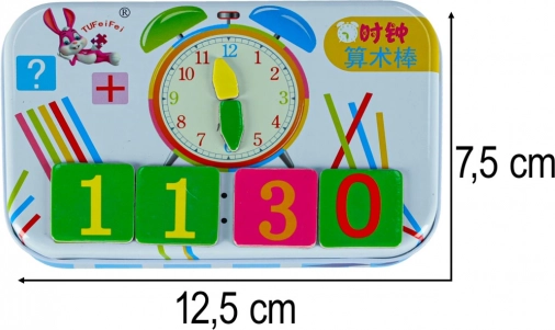 Oktató készlet az órák és a számolás tanulásához gyerekeknek. Mágneses kártyák, mutatók, fa pálcikák és fém tok. Ideális iskolába és utazáshoz is.