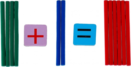 - 50 db színes fa pálcika, 4× óramutató, 28 db mágneses kártya számokkal és matematikai jelekkel, fém tok