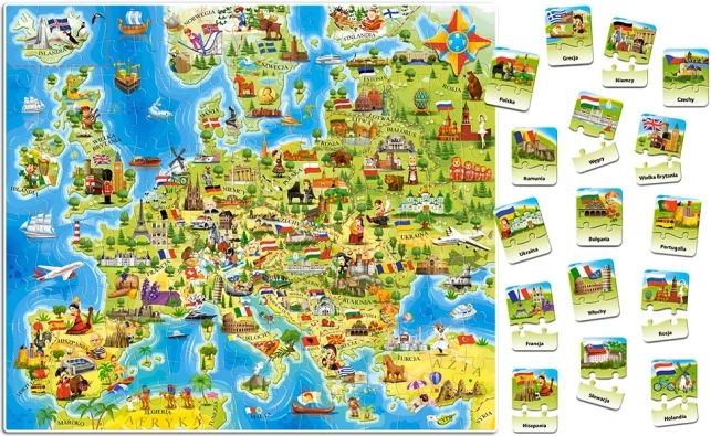 A Castorland Európa térképe oktató puzzle ötvözi a szórakozást és a tanulást. A gyerekek egy nagy kontinens-térképet raknak ki, miközben a kvízdarabok segítségével felfedezik az egyes országok fővárosait, nevezetességeit és jellegzetes szimbólumait. A térképen megtalálható például a Károly-híd Csehországban, a Colosseum Olaszországban, az Eiffel-torony Franciaországban, a Brandenburger kapu Németországban, a Sagrada Família Spanyolországban vagy az Akropolisz Görögországban.