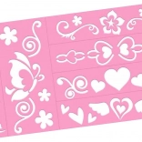 Többször használható sablonok virágokkal, szívecskékkel és pillangókkal segítik a kedvenc motívumok gyors és tiszta megrajzolását.