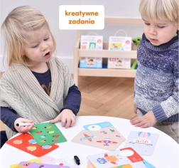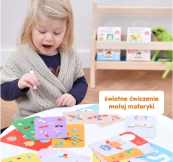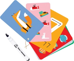 A készlet színes, humoros illusztrációkat tartalmaz, amelyek kreatív tevékenységekre ösztönzik a gyerekeket. A kártyák lehetővé teszik az ismételt rajzolást és törlést, ami nagyszerű oktatási ajándék az óvodás korú gyerekeknek. Ideális utazáskor is a gyerekekkel.