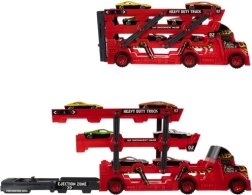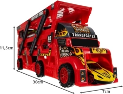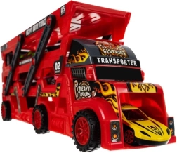 A piros autószállító a kis versenyzőknek 3 szintes platformot, lehajtható hátsó rámpát és első kijáratot kínál. A csomagban 6 fém kisautó és egy szórakoztató kilövő található a villámrajtokhoz és az akciódús játékhoz.