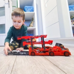 Ez a strapabíró autószállító vonzó dizájnt ötvöz okos funkciókkal és órákon át tartó kreatív szórakozásért. A háromszintes platform kényelmesen befogadja mind a hat kisautót, a hátsó lehajtható rámpa megkönnyíti a felhajtást, az első kijárat pedig további lehetőségeket ad a játékhoz. A fém, die-cast kisautók és a részletgazdag kidolgozás valósághű élményt nyújtanak, a gyerekek pedig fejlesztik fantáziájukat és finommotorikájukat.