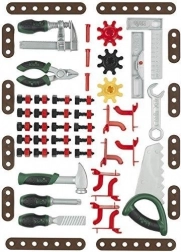 Fűrész, kalapács, villáskulcsok, harapófogó, reszelők, csavarok és kötőelemek – minden, amire a gyermeknek szüksége lehet építéshez és csavarozáshoz.