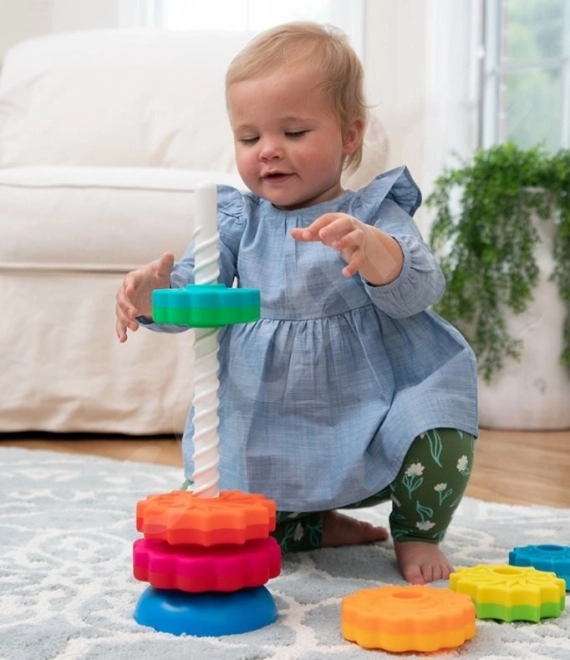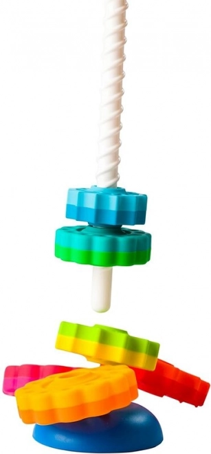 Játék, amely fejleszti a gyermek finommotorikáját. A 6 különböző korong csavarvonalban forog lefelé, és tetszés szerint egymásra rakható. A korongok virág- és csillagformák között váltakoznak, és mindegyik két színű.