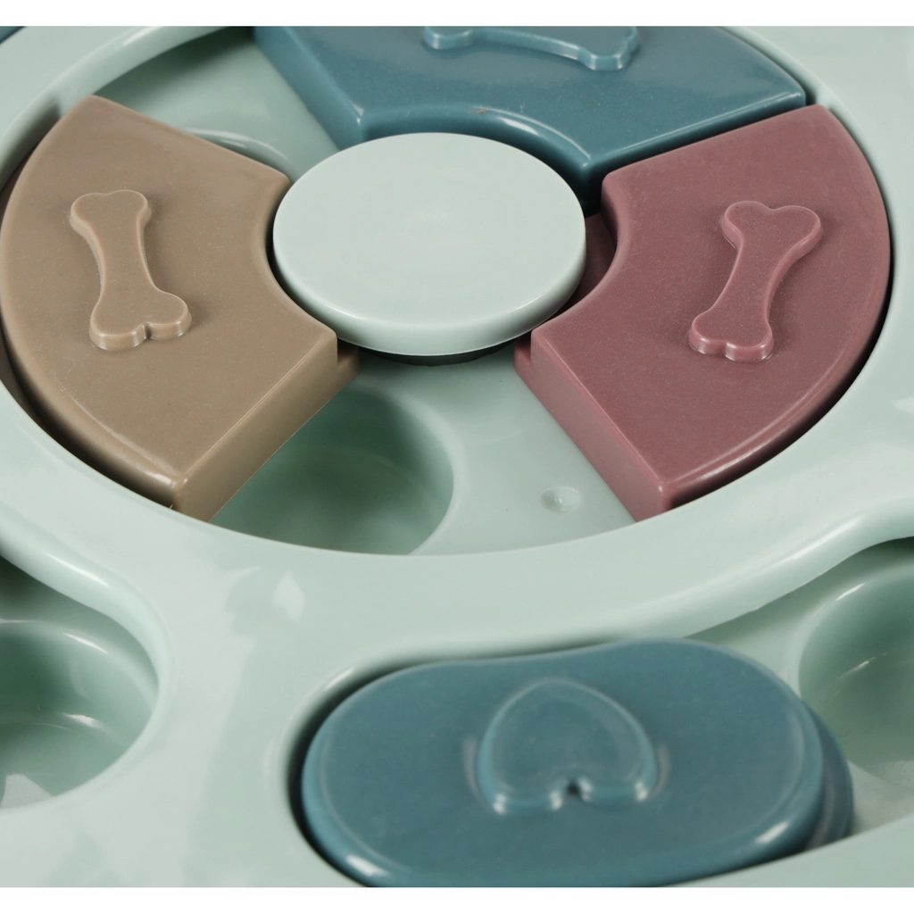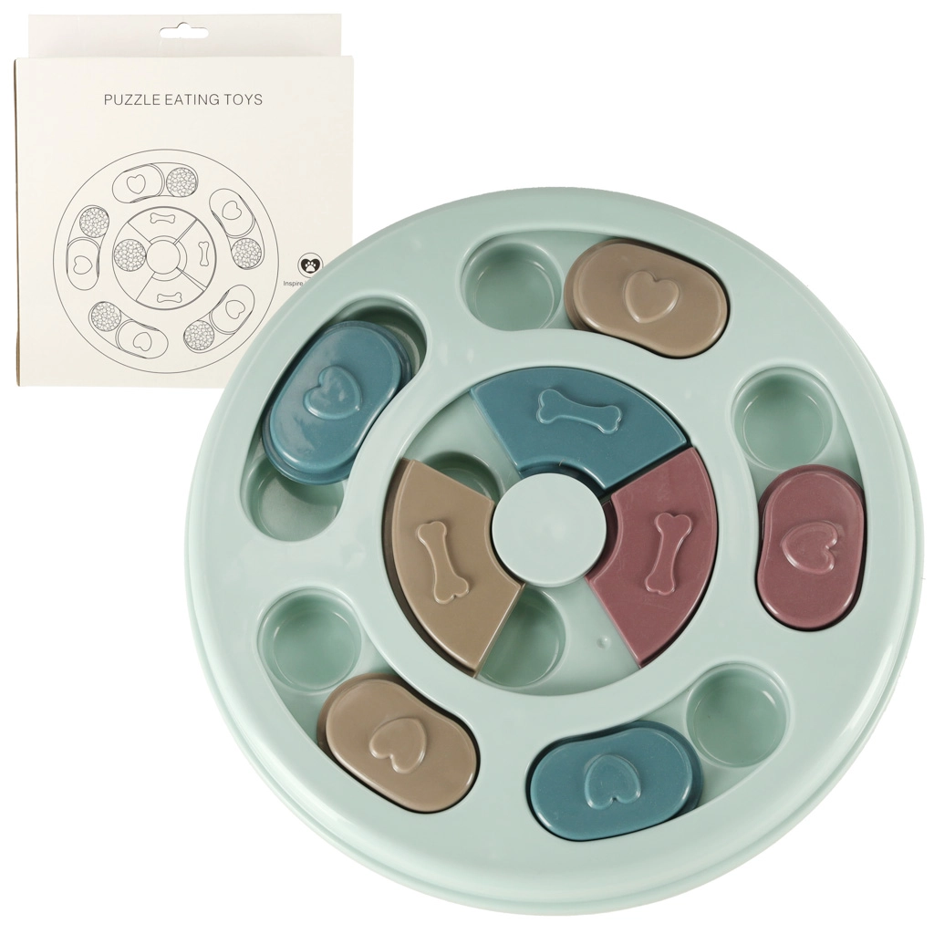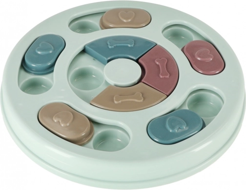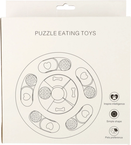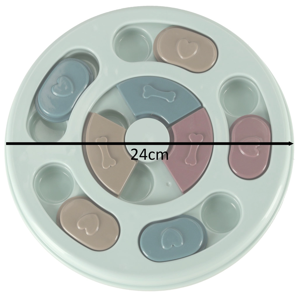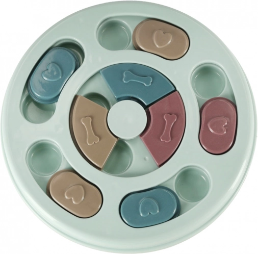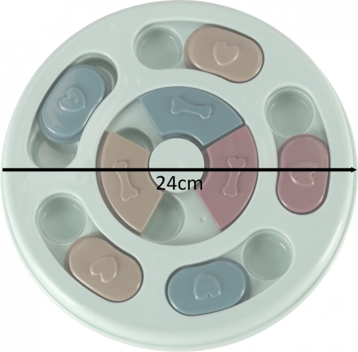 Interaktív, etetést lassító kutyatál. Fejtörő csúsztatható elemekkel, csúszásgátlóval, műanyagból, 24 cm átmérővel. Egészségesebb és szórakoztatóbb etetés.