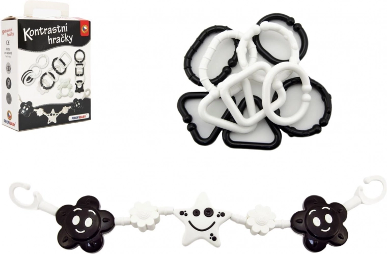 Kontrasztos babajáték szett – csörgők, rágóka és függő lánc babakocsira
