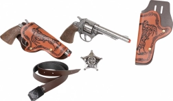 Ez a minőségi GONHER cowboy készlet valósághű megjelenést és hanghatást nyújt a 8-lövetű (táras) szalagos mechanizmusnak köszönhetően. A fém kivitel nagyobb tartósságot és hosszú élettartamot biztosít, míg a mellékelt tok és jelvény teljessé teszi a kis seriff autentikus külsejét.