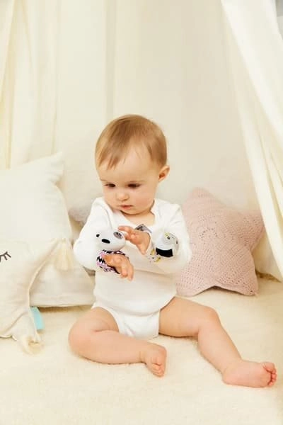 Fedezze fel a majom és panda motívummal ellátott, csuklóra való csörgőt, amely serkenti a baba érzékeit és támogatja a természetes fejlődést. A kontrasztos minták felkeltik a figyelmet, a lágy csörgő hang pedig kellemes és nem tolakodó. Az állítható tépőzárnak köszönhetően a csörgő kényelmesen illeszkedik a kicsi csuklójára, ugyanakkor kézben tartva is használható, mint egy hagyományos játék.