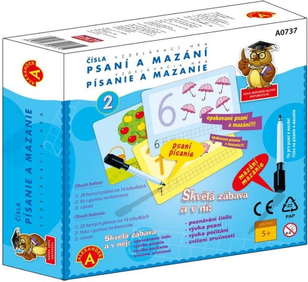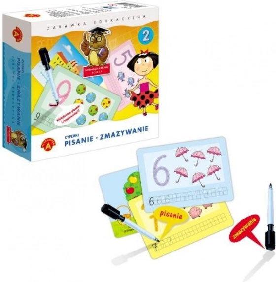 Szórakoztató oktatójáték óvodásoknak, amely segít a gyerekeknek elsajátítani a számjegyek helyes alakját, azok felismerését és a számlálás alapjait. Az ismételten használható tábláknak a törölhető filccel köszönhetően a gyerekek finommotorikát, észlelést és összpontosítást is gyakorolnak – mindezt játékos formában.