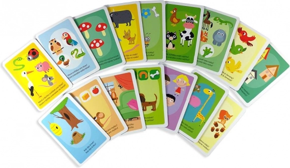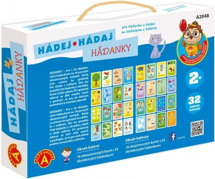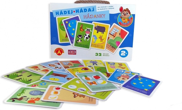 16 nagy színes tábla (32 képes találós kérdés), cseh és szlovák útmutató, erős fogantyús doboz