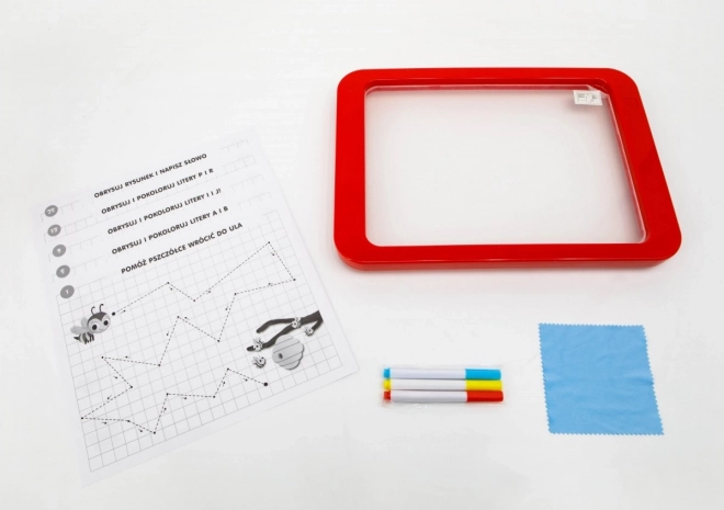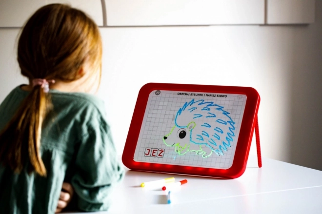 A Tabule LED Carotina ideális oktatási eszköz a gyerekek számára. 30 oktatókártyára épülő oktatóprogramot kínál, amelyet a programozott másolási módszer segítségével lehet használni. Csak helyezze a kártyát a papíralapra, és tegye a tábla átlátszó képernyője alá. A rajzolást három fluoreszcens marker segítségével végezheti, amelyek a készlet részét képezik. Ezekkel a markerekkel a gyerekek újra és újra rajzolhatnak, és száraz törlőkendővel eltávolíthatják a rajzokat. A LED tábla sokoldalú, mint egy klasszikus tábla, és szinte úgy világít, mint egy neonfelirat!