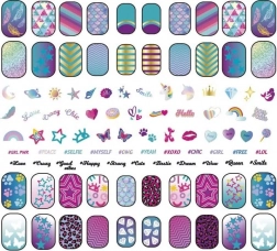 Színes lakkok, műkörmök és tematikus matricák kreatív motívumkeveréshez, a csillagoktól a csíkokon át a színátmenetekig.