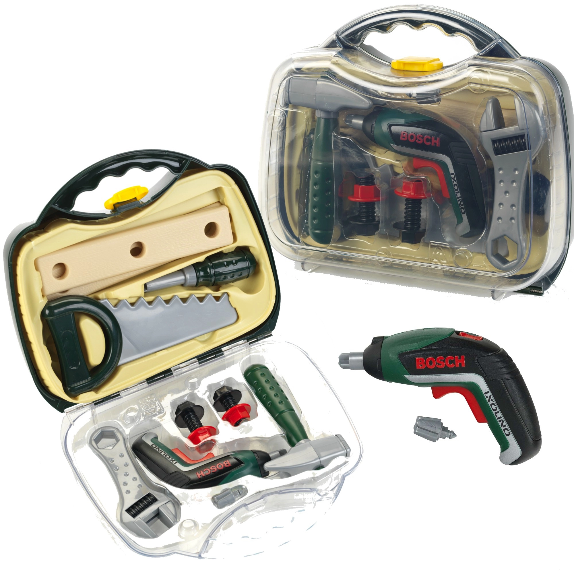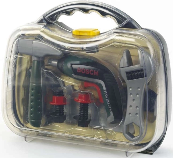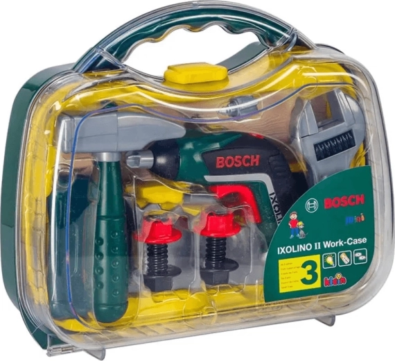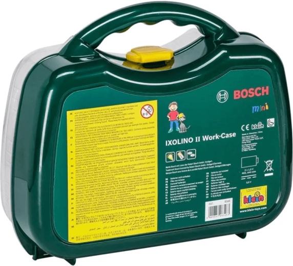 Gyermek szerszámos koffer a licencelt BOSCH Mini sorozatból a KLEIN márkától, amely valósághű szerelős játékot kínál. Belül egy elemes Ixolino II akkucsavarozó található jobbra/balra forgással és motorhanggal, kiegészítve további tartós szerszámokkal. A masszív, sötétzöld koffer átlátszó fedéllel és két piros zárral biztonságosan egyben tart mindent, és ideális a 3 éves kortól ajánlott kis ezermestereknek.