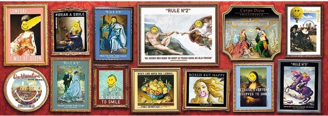 A vidám SMILEY Galéria motívumú panorámakirakó órákon át tartó, nyugodt szórakozást kínál felnőtteknek és nagyobb gyerekeknek egyaránt. A panorama formátum összeállítva szépen érvényesül a belső térben, és a minőségi nyomtatásnak köszönhetően minden részlet kiemelkedik.