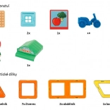 7 négyzet, 4 háromszög, 2 téglalap, 1 rombusz, 7 műanyag kiegészítő, 1 figura
