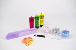 Keltsd életre a frizurákat a kreatív készlettel kis stylistoknak! Tartalmaz 3 színes gélt, 3 csillámos szóróport, gumigyűrűket, ecsetet és fésűt az egyszerű felvitelhez és egyedi lookok készítéséhez.