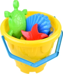 A kék fogantyús műanyag vödör és a benne lévő formák lehetővé teszik a könnyű szállítást a strandra vagy a kertbe.