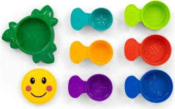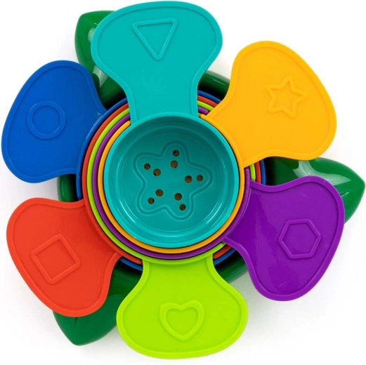 A Milly Mally Flower összerakható fürdőjáték. 6 színes pohár egymásba rakáshoz, toronyépítéshez, illetve homokformaként. Mindegyik alján nyílások vannak, így lehet velük vizet folyatni, homokot szitálni játékhoz, a játszótéren vagy a strandon. A poharak színei és dombornyomott mintái segítik a tanulást.