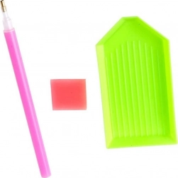 Egyszerű lépések: fokozatosan húzza le a védőfóliát a ragadós felületről, vegyen viaszt a toll hegyére, szórja a köveket a tálcába, majd a vásznon jelölt szimbólumok szerint ragassza fel őket egyenként. A befejezett szín köveit tegye vissza a tasakba, és folytassa a következő színnel.