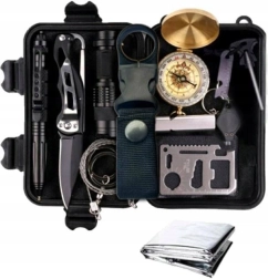 A csomag része a masszív túlélőkártya rozsdamentes acélból, összecsukható kés, két LED fényforrás (taktikai és jelző), zárható iránytű, mentőtakaró 160 × 210 cm, drótfűrész, magnézium tűzgyújtó kaparóval, vészsíp és palackklipsz. Mindez egy erős, kompakt tokban, amely védi a tartalmát, és rendezetten egyben tartja.