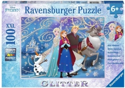 A 100 darabos XXL Puzzle a Jégvarázs mese kedvelt hőseit ábrázolja, csillámló elemekkel kiegészítve.