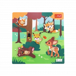 A színes grafikával díszített, erdei állatos fa kirakó úgy készült, hogy egyszerre szórakoztassa a gyerekeket és fejlessze készségeiket. Minden darab masszív, jól megfogható, és fa gombbal van ellátva a könnyű kiemeléshez. Az alaplap kimart formákkal és a darabbal megegyező fekete–fehér képpel segít az intuitív párosításban.