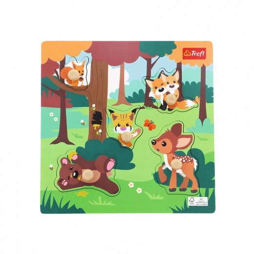 Fából készült kirakó – Erdei állatok, 5 darabbal és fogókkal. Fejleszti a finommotorikát és a formafelismerést. Biztonságos, tartós, 18 hónapos kortól ajánlott.