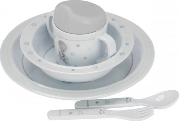 Ez a készlet kifejezetten kisgyermekek számára készült, designja megkönnyíti a megfogást és a használatot. A csúszásmentes gumi a tányér, tál és bögre alján segíti az étkészlet szilárdan a helyén tartását étkezés közben, ami támogatja a függetlenséget az étkezés során.