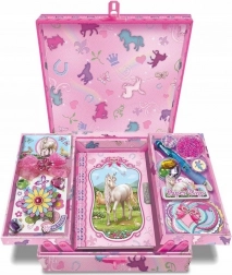 Fedezze fel a praktikus rendszerezést és a varázslatos designt: a dekoratív, unikornisos doboz kinyitásakor két oldalsó, kihajtható polc tárul fel, amelyek alatt biztonságos hely rejtőzik a naplónak. Ideális a gyerekszobába, és eredeti tárolódoboz apróságok számára.