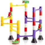 A moduláris csövek, oszlopok és sínek pontosan illeszkednek egymáshoz. A gyerekek gyorsan megértik az építés logikáját, és folyamatosan változtathatják a golyók útvonalát.