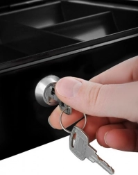 A rekeszes belső műanyag tálca átláthatóan rendezi az érméket és bankjegyeket, így gyorsabb a pénztárnál végzett munka.