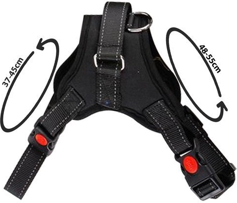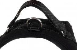 A hám könnyen beállítható a nyak- és mellkas körfogatára. A blokkolással ellátott gyorskioldós csatok biztos rögzítést nyújtanak, míg a fényvisszaverő varrások növelik a láthatóságot szürkületben. A praktikus felső fogantyú segít a kutya kontrollálásában nehéz helyzetekben, a fém D-gyűrű pedig a póráz biztonságos rögzítésére szolgál.