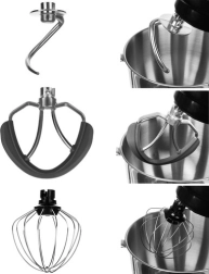 A robot három különböző fejjel rendelkezik: habverő, dagasztó és keverő. Nélkülözhetetlen eszközök a tészták, krémek és minden kedvenc finomsága előkészítéshez. Ezenkívül stílusos kiegészítőket tartalmaz, mint a cukrász zsák, csővégek és tojás elválasztó.