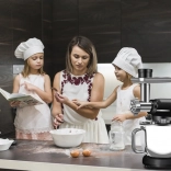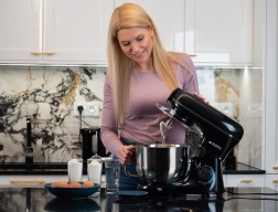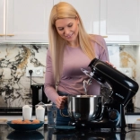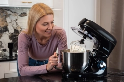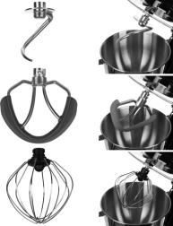 A csomagban három feltét található: dagasztóhorog, ballon habverő és keverőfej szilikon spatulákkal az alapanyagok tökéletes egyesítéséhez. A stabil talp csúszásgátló tapadókorongokkal, a biztonsági retesz és a piros LED-del megvilágított vezérlőgomb megbízható társsá teszik sütéshez és mindennapi főzéshez.