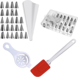 - cukrász habzsák + 24 díszítőcső rendezőben, tojáselválasztó, spatula
