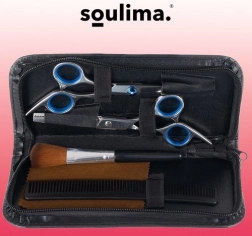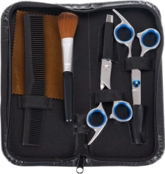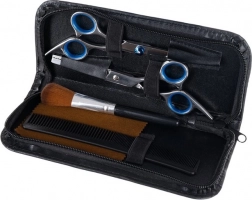 - olló, ritkító olló (27 fog), fésű, ecset, tisztítókendő, fodrász köpeny, tok