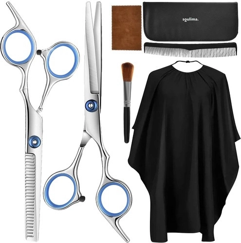Teljes fodrászkészlet otthoni és professzionális használatra, 2 pár ollóval (klasszikus és ritkító/effiláló), védőköpennyel, fésűvel, ecsettel és cipzáros tokkal. Minőségi rozsdamentes acél ollók ergonomikus ujjtámaszokkal és kék betétekkel a precíz vágásért és kényelemért. Minden áttekinthetően elrendezve a biztonságos tároláshoz és utazáshoz.