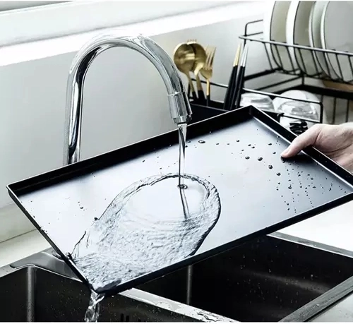A sima műanyag tálca felfogja a lecsöpögő vizet és szárazon tartja a munkafelületet. Mosogatás után egyszerűen öblítse le folyó víz alatt – a karbantartás pillanatok kérdése.