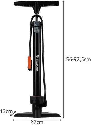 A megbízható TRIZAND padlós pumpa strapabíró fém szerkezetet és pontos nyomásmérést kínál a analóg manométer segítségével. A hosszú tömlő gyorsrögzítős zárral kényelmesen elér a szelepekhez, és légveszteség nélkül, biztonságosan tömít. A 16 bar / 230 PSI maximális nyomás lefedi az országúti külsőket, valamint más sport- és szabadidős felszereléseket is.