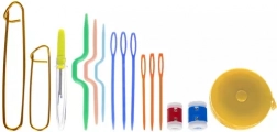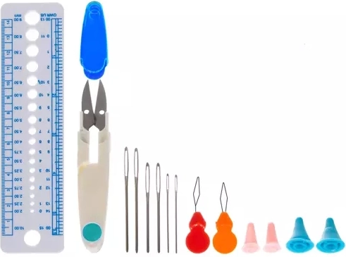 A készlet nemcsak tűket, hanem ollót, vonalzót és további eszközöket is tartalmaz, amelyek a horgoláshoz szükségesek.