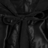 Ez a hosszú fekete kapucnis köpeny ideális kiegészítő varázsló-, boszorkány-, vámpír- vagy misztikus karakterjelmezekhez. A egyszerű, zsinórral való megkötésnek köszönhetően könnyen felvehető a hétköznapi ruhára, a laza szabás pedig nem korlátoz – tökéletes tánchoz és fotózáshoz.