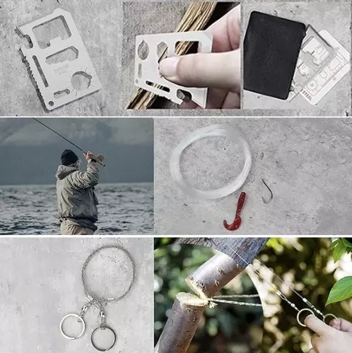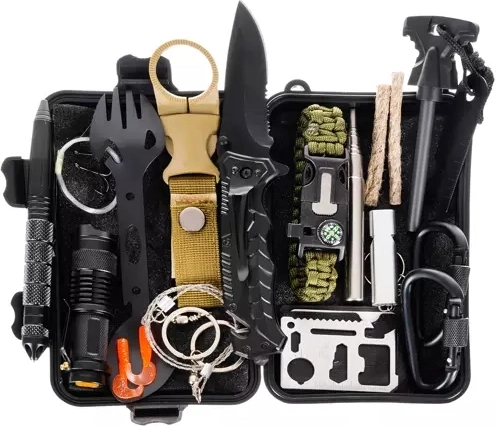 összecsukható kés fűrésszel és zsinórvágóval, taktikai toll, 11 az 1-ben túlélőkártya, tűzgyújtó magnéziumrúddal és skanddal vonalzóval és nyitóval, zseblámpa, hőtakaró 130 × 210 cm, zárható tartály, palacktartó övre, paracord karkötő (kb. 3,5 m zsinór) iránytűvel, síppal és tűzcsiholóval, 2 db szilikon csali + damil + 2 horog, étkészlet (kanál/villa nyitóval + kis kés), összecsukható síp, 2 db gyújtózsinór, 2 db karabiner, kb. 60 cm-es drótfűrész
