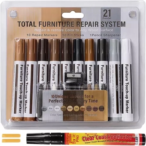 A bútorok karcainak javítása még sosem volt ilyen egyszerű. Javítókészletünkkel kitöltheti a mélyebb repedéseket viasszal, majd a megfelelő színű filccel kialakíthatja a fa textúráját.<7dv>