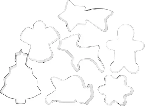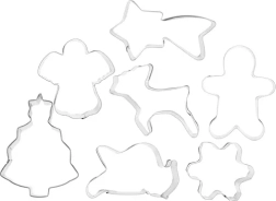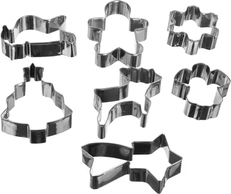 Praktikus, 7 darabos fém süteménykiszúró készlet rozsdamentes acélból a karácsonyi aprósütemények könnyű sütéséhez. Kínál éles vágást, kényelmes, profilozott peremet és 7 népszerű formát. Ideális mézeskalácshoz, kekszhez és fondanthoz – tartós és könnyen tisztítható.