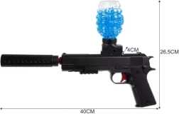 A csomag mindent tartalmaz az azonnali játékhoz: 6000 víz (gél) golyó az előkészítéshez, 5 hablövedék, hangtompító, USB kábel a töltéshez, védőszemüveg és csavarhúzó. A golyókat csak vízbe kell szórni, kb. 3 órát ázni hagyni (átmérő 7–8 mm), és már indulhat is az akció akár 15 méteres hatótávval.