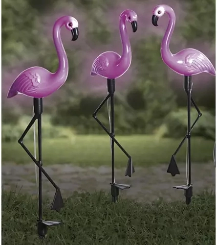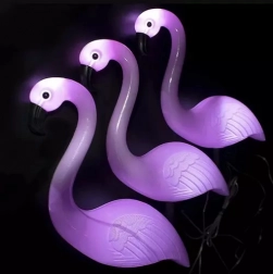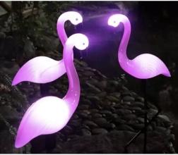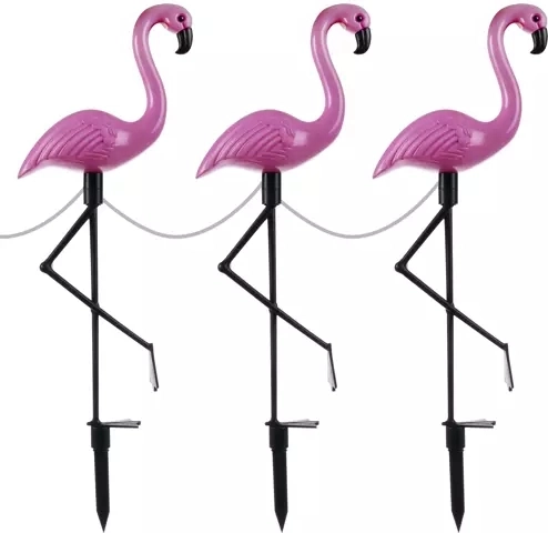 A csomag három flamingó formájú lámpát tartalmaz, amelyeket napelemekkel kapcsoltak össze, és LED-ekkel vannak felszerelve a finom világításhoz.