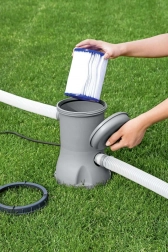 A karbantartás gyors és kényelmes: a betétet elég kivenni és tiszta vízzel leöblíteni. A legjobb eredmény érdekében a cserét hozzávetőleg 2 hetente javasoljuk, a medence igénybevételétől függően. Az előnyös 2 darabos csomag megkönnyíti a rendszeres karbantartást és minimalizálja az állásidőt (a szivattyú nem része a csomagnak).