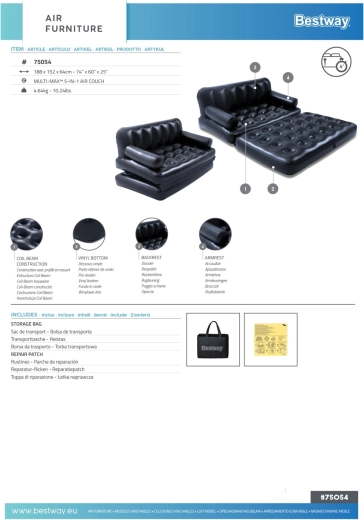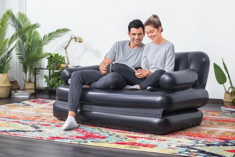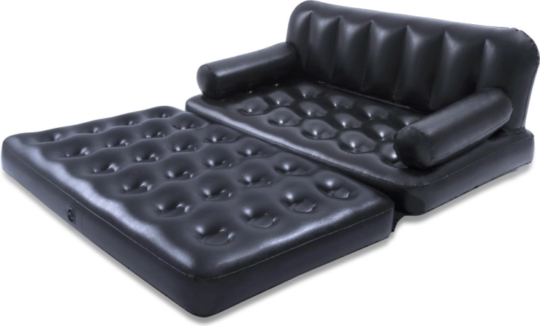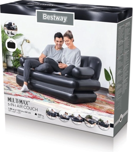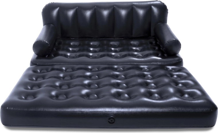 A BESTWAY 5 az 1-ben univerzális felfújható kanapé kényelmes ülést és kétszemélyes alvóhelyet egyesít. Kanapéként, nyugágyként és franciaágynak is használható dupla réteggel. Tartós PVC, stabil Coil Beam szerkezet és gyorsleeresztő szelep biztosítja a könnyű használatot, a kényelmet és a hosszú élettartamot beltéri környezetben.