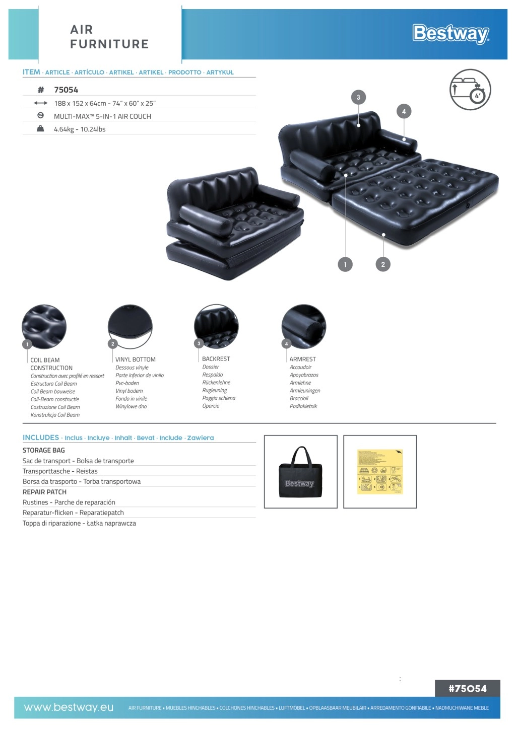 A BESTWAY 5 az 1-ben felfújható ülőgarnitúra tökéletes megoldás nappaliba, vendégszobába vagy diákszállásra. Okos, moduláris kialakításának hála pillanatok alatt átalakítható kényelmes kétszemélyes kanapéról nyugággyá vagy teljes értékű franciaággyá. Bársonyos tapintású felülete és kamrás kialakítása növeli a kényelmet ülésnél és alvásnál is.